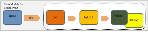 为了提升护理服务效率降低人力成本,美国养老社区发展逐渐集约化,社区一般由“独立型老人公寓”、“辅助型老人公寓”、“老人康复院/护理院”组成,老人在身体状况和自理能力变化时,搬入不同的公寓。由于美国移民观念的影响,美国人接受采取多次“搬家”进行养老的形式。